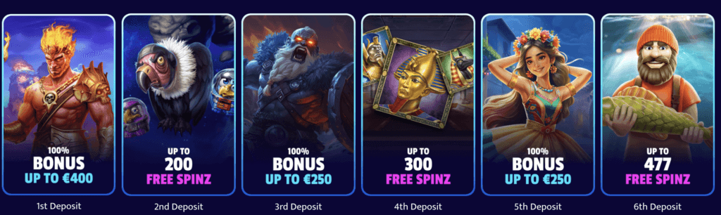 Välkomstbonusen består av sex insättningsbaserade erbjudanden med bonuspengar och free spins. Totalt kan du få upp till 900 euro i bonus och 977 free spins. Bonusen är uppdelad över flera insättningar, vilket gör att du inte behöver använda allt på en gång.